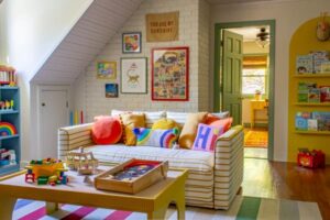 Our colorful playroom was such a fun place to put together! I started by choosing the rainbow stripe rug and then picked a few colors to carry throughout the space.