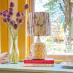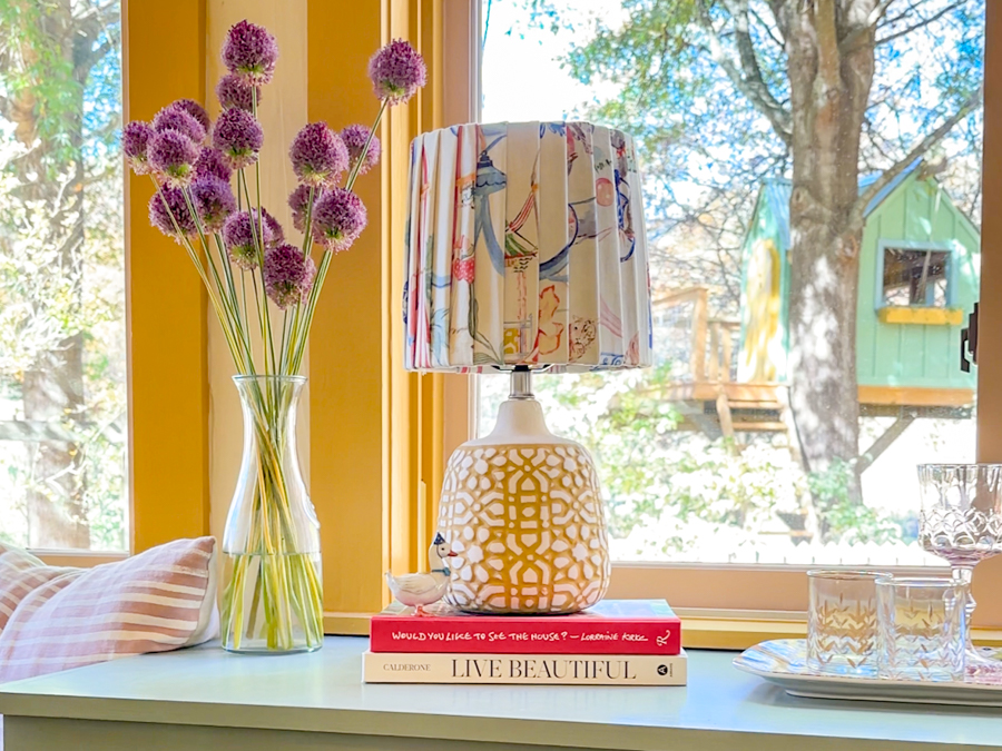 This article shares step-by-step instructions for how to cover a lamp shade with pleated fabric.