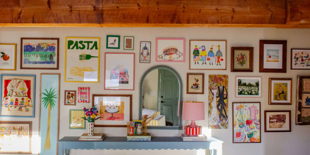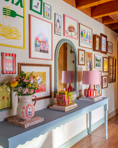 I thought it would be helpful to pull together the art on our gallery wall in the entryway. It’s a mix of finds from Artfully Walls, Etsy and local artists. I mix and matched the frames in a variety of paint colors and finishes. I love an eclectic gallery wall!