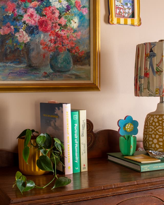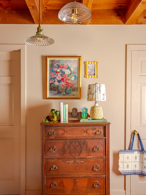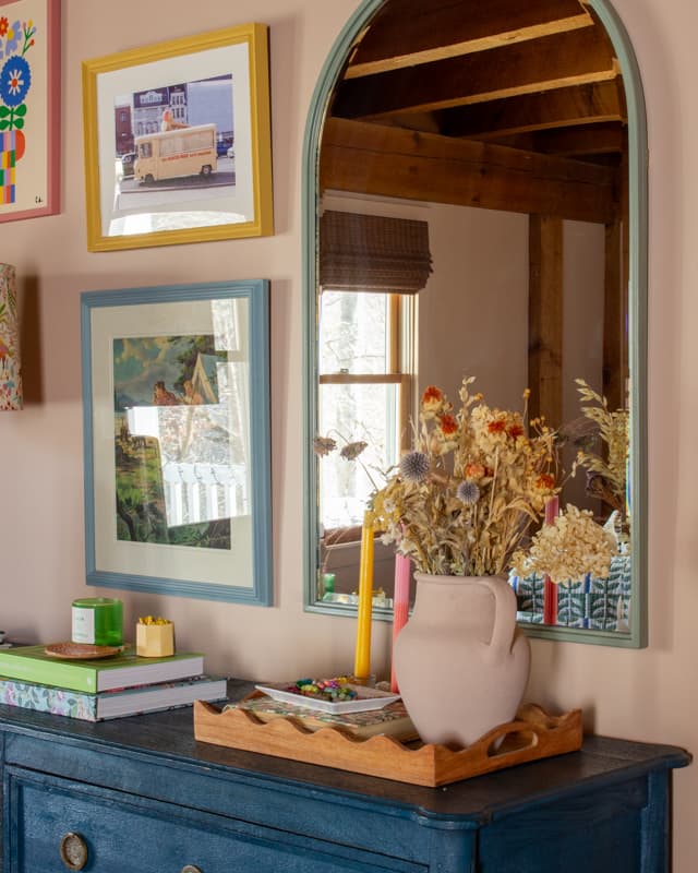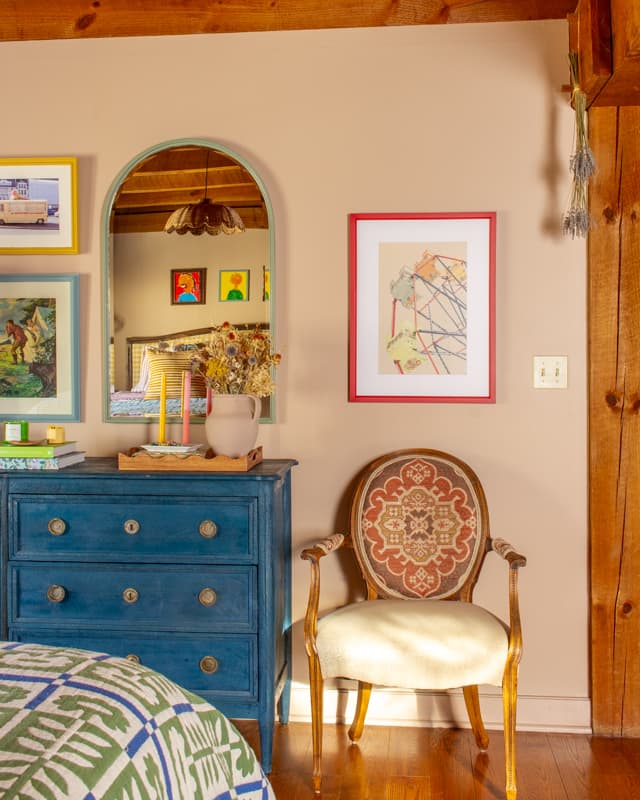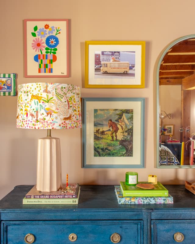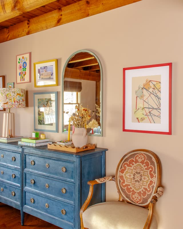 After the paint color, I layered in fun art with colorful frames and quirky finds to make the space feel joyful and personal. This also took time, and I didn’t get everything hung until this past December (5 years after moving in!)
