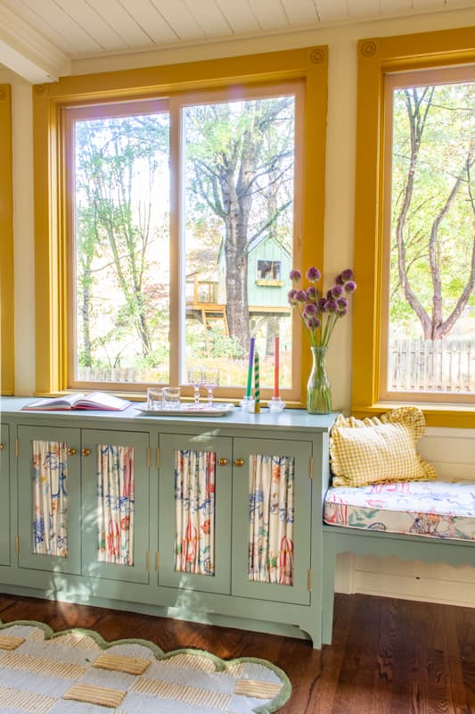 If Card Room Green is the backbone, India Yellow is the star. I started small with the color– just a few picture frames painted with a sample can– and got bold when I painted the dining room trim. It’s visible from the kitchen and it is a showstopper.